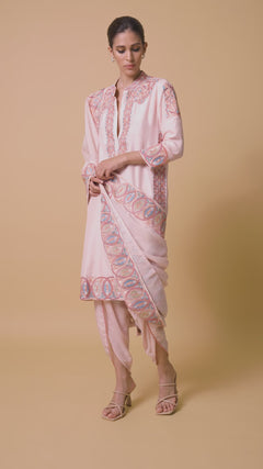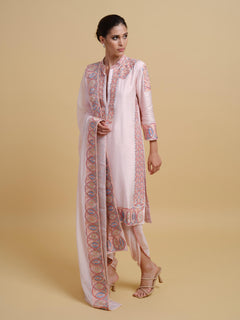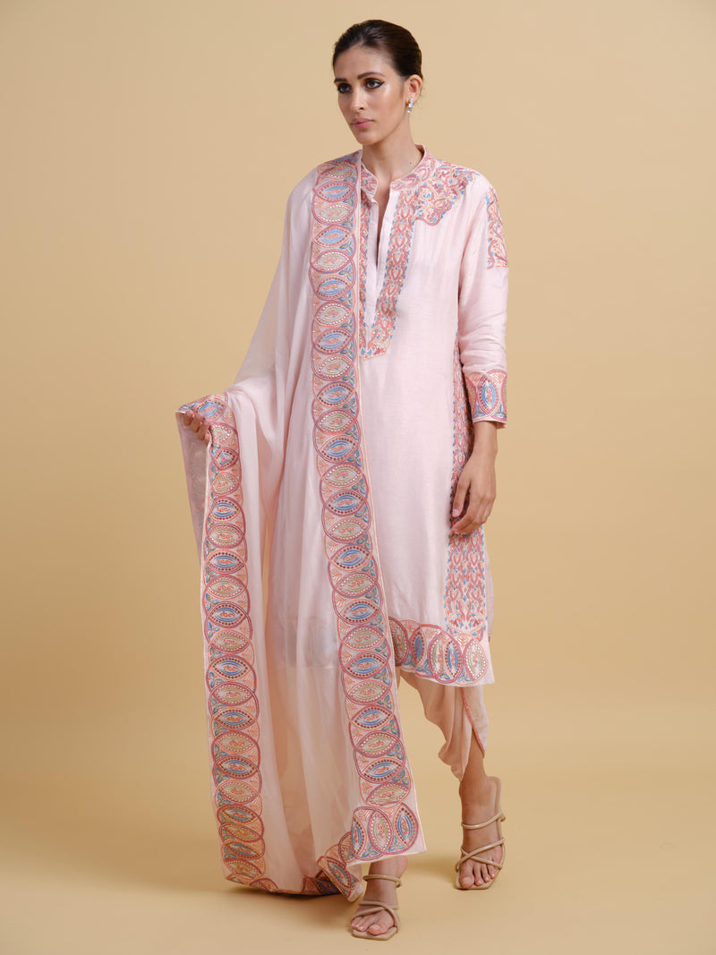 A timeless expression of grace, this pastel pink salwar kurta set is beautifully adorned with delicate intricate embroidery around the neckline, on the shoulders juxtaposed with generous motifs along the cuffs of the sleeve, and the borders – adding refined detail from every angle. The back is thoughtfully finished with embroidery along the neckline and trailing down for a graceful touch. Paired with contemporary draped pants, the ensemble blends classic charm with modern ease. Completing the look is a lightweight scarf, framed with intricate embroidery on all four sides, offering a soft yet striking finish to the ensemble.