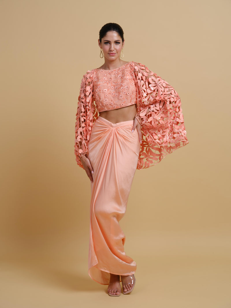 A captivating skirt set that celebrates intricate craftsmanship and timeless femininity. The top is adorned with three-dimensional hand-embroidered flowers, creating a delicate yet sculptural bloom effect. Paired with a gracefully draped skirt that flows effortlessly, the look is elevated by a statement jacket—fully hand-beaded with floral motifs and seamlessly connected through exquisite hand embellishment. Every detail reflects a harmonious blend of texture, artistry, and modern elegance.