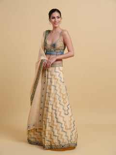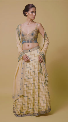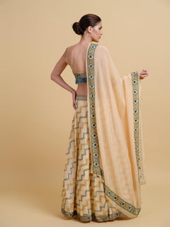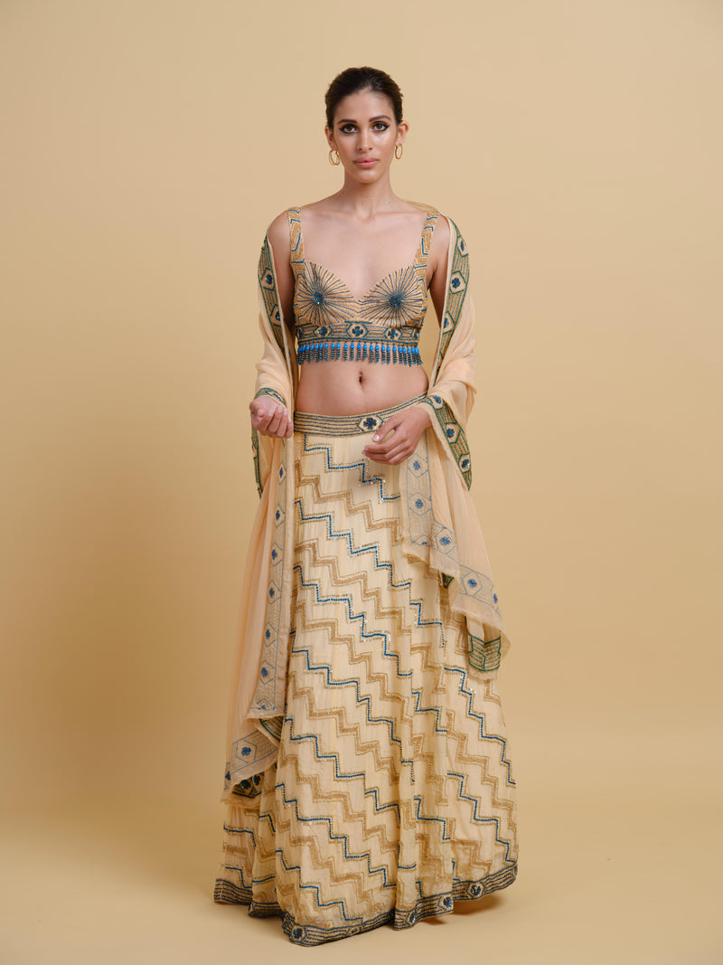 A contemporary celebration of craft, this striking skirt features geometric embroidery brought to life with intricate embellishment. Paired with a meticulously embroidered blouse, adorned with hand-placed embellishments and delicate beaded tassels that add playful movement and charm to the silhouette. Completing the look is a lightweight scarf, finished with an intricately embellished border that glimmers with every fold.