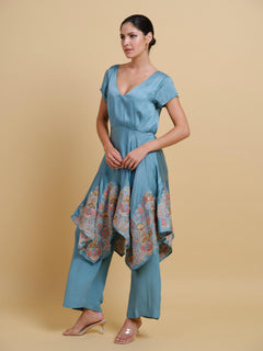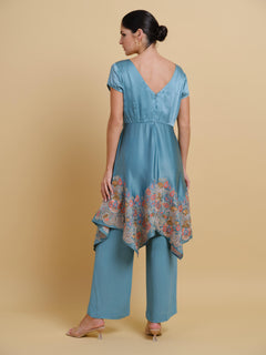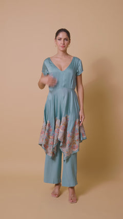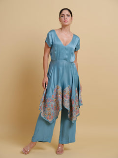 A modern silhouette with an artisana touch, this pant and long top set is designed to make a statement. The top features fluid handkerchief hems, each edge adorned with intricately embroidered motifs that add texture and elegance to its asymmetric flow. A plunging deep neckline lends a bold, contemporary edge, perfectly balanced by the relaxed yet tailored fit of cropped pant.