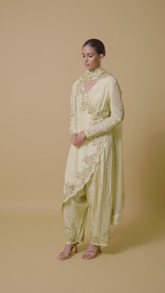 This enchanting salwar kameez in delicate lemon yellow evokes the freshness of spring with its luminous hue and thoughtful design elements. The kameez features striking diagonal embroidery that sweeps across the front, and the long sleeves creating a visual interest and a flattering asymmetrical effect. The distinctive hemline follows this same diagonal pattern, offering a contemporary twist on the traditional straight cut. Accompanying this elegant top are coordinating pants adorned with vertical embroidery and floral embroidery on the border. Completing this look is a scarf with embroidery running along the border.