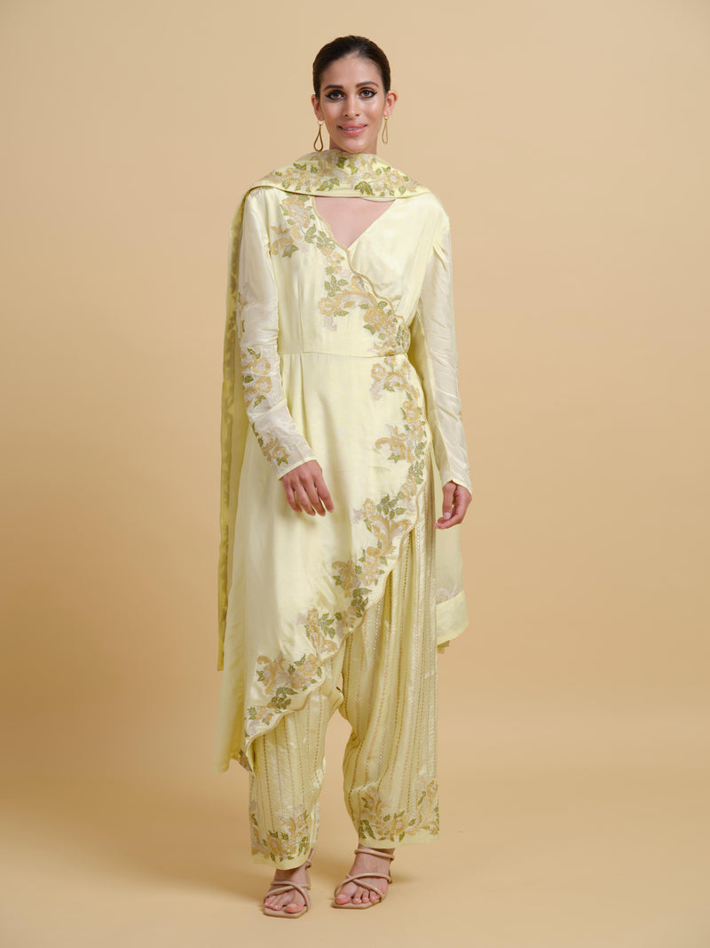 This enchanting lemon yellow salwar kameez is part of a meticulously crafted kurta set that evokes the freshness of spring. The kameez features striking diagonal embroidery sweeping across the front, with long sleeves creating visual interest and a flattering asymmetrical effect. The distinctive hemline mirrors this diagonal pattern, offering a contemporary twist on the traditional straight cut. Coordinating pants are adorned with vertical embroidery and a floral border, while the scarf is finished with elegant border embroidery, completing this sophisticated ensemble.