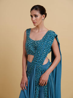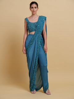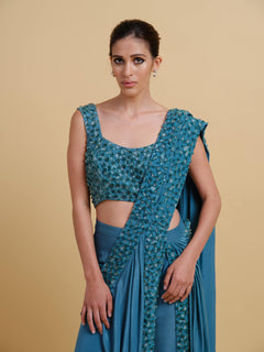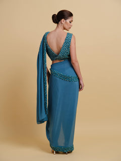 A striking fusion of tradition and contemporary design, this teal blue saree is draped with a modern, fluid silhouette that exudes effortless elegance. This border is adorned with intricate three-dimensional hand embroidery, adding texture and depth to the soft drape. Paired with a perfectly tailored blouse, also featuring exquisite three-dimensional hand embroidery, this ensemble offers a bold yet refined modern twist on classic saree styling – where artisanal craftsmanship meets contemporary allure.