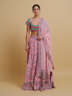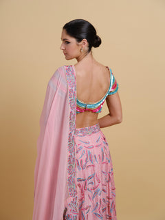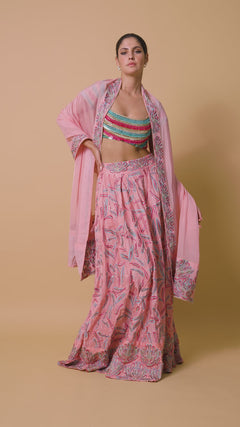 Drenched in a playful candy pink hue, this vibrant ensemble brings together whimsy and craftsmanship. The skirt features abstract embroidery scattered with shimmering sequin embellishments, creating a dynamic surface that catches light with every step paired with a multi embroidered blouse in matching candy pink, the intricate sequins work adds layers of texture and visual interest. A delicate scarf completes the look, edged with a finely embroidered and embellished border.