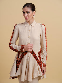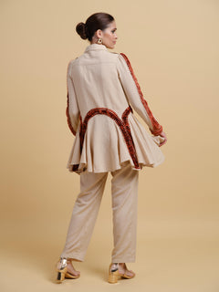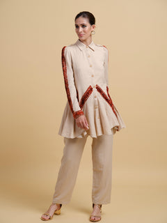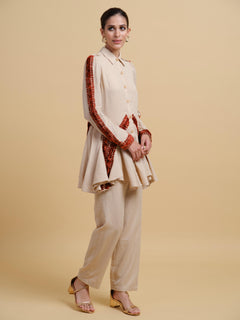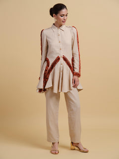 A seamless blend of contemporary structure and intricate craftsmanship, this ensemble features a beautifully tailored top adorned with three dimensional embroidery running elegantly along the sleeves, front and back. Paired with sleek straight-fit pants this look strikes the perfect balance between modern minimalism and timeless