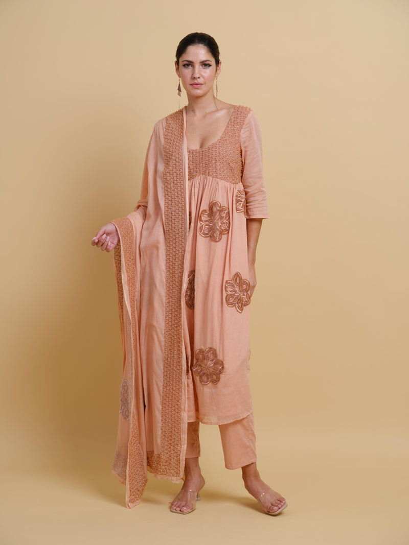 The kurta set features a top with intricate embroidery across the chest area, creating a beautiful focal point that draws the eye. Adorning the entire front are generous floral motifs, meticulously hand-embroidered and carefully embellished to add dimension and texture. The sophisticated silhouette is enhanced by its plunging deep neckline, offering a contemporary twist on traditional form. Completing this refined outfit is a coordinating scarf that features embroidered motifs echoing those on the top, along with an embroidered border adding a final touch of craftsmanship.