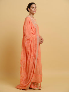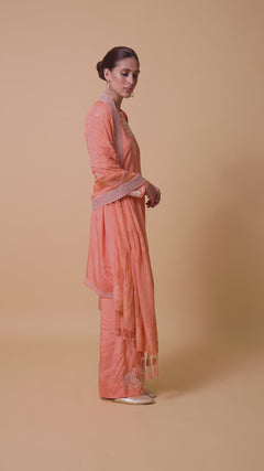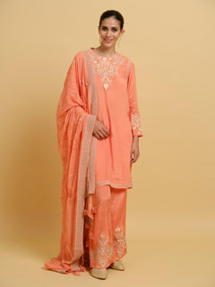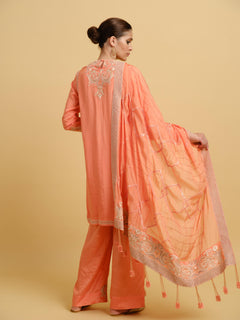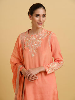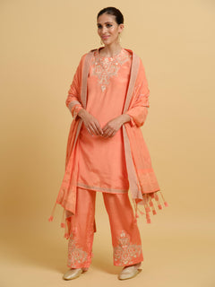 This vibrant orange salwar kurta ensemble captivates with its rich color and meticulous craftsmanship. The kurta features an exquisitely embroidered neckline that serves as a stunning focal point, showcasing detailed handwork. Complementing this are the straight-cut pants, which are adorned with harmonious embroidery patterns that create visual continuity with the kurta's design elements. The lightweight scarf has geometric patterns in square, hand beaded along with an embroidered border finished with elegant long fringes that sway gracefully.