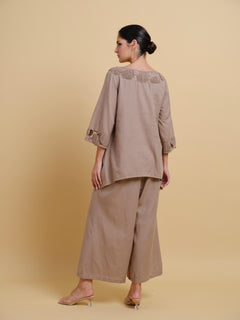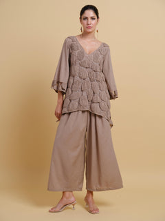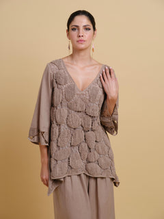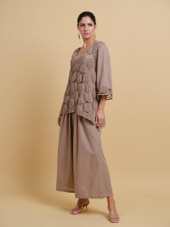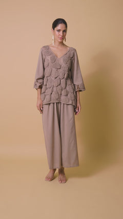 This design features an innovative top where individually hand-crafted textile patches are artfully connected using intricate threadwork, each patch tells its own tactile story. Combined with flowy pants this outfit is a statement relaxed style.