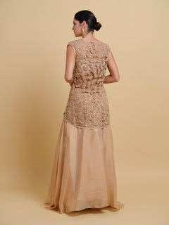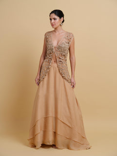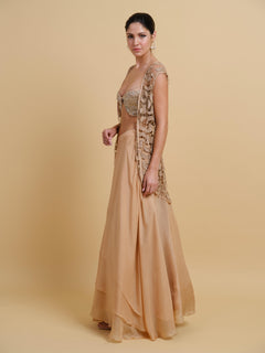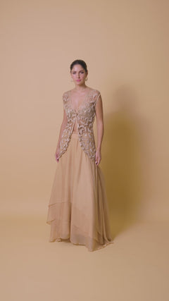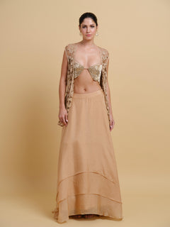 This design features a crystal studded bralette with individually hand-crafted studded patches artfully connected using intricate beadwork, teamed with a chiffon tiered skirt.