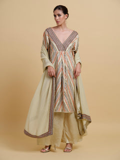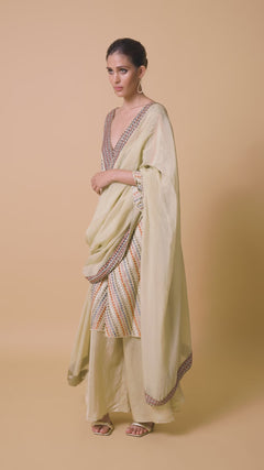 The sophisticated ensemble features a stunning combination of craftsmanship and style. The top showcases exquisite full machine embroidery, creating intricate patterns with precision and consistency throughout the fabric. Elevating this piece is the neckline, which has been meticulously hand embellished, adding a touch of artisanal luxury and creating a beautiful focal point. The palazzo pants offer a graceful, flowy silhouette that moves elegantly with every step, perfectly balancing the detailed top. Completing this refined outfit is a coordinating scarf adorned with a distinctive hand embroidered border.