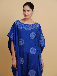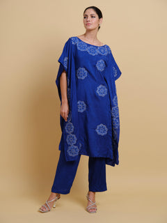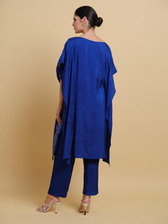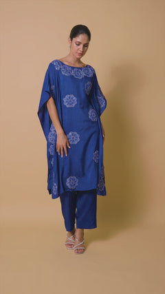 A statement ensemble that blends contemporary ease with intricate craftsmanship. This long top features dramatic bat-wing sleeves, offering a fluid and modern silhouette. The design is elevated with oversized embroidered motifs meticulously hand-embellished, placed along the neckline, border and artfully scattered across the front. Paired with sleek cropped pants, this look strikes the perfect balance between relaxed elegance and detailed artistry.